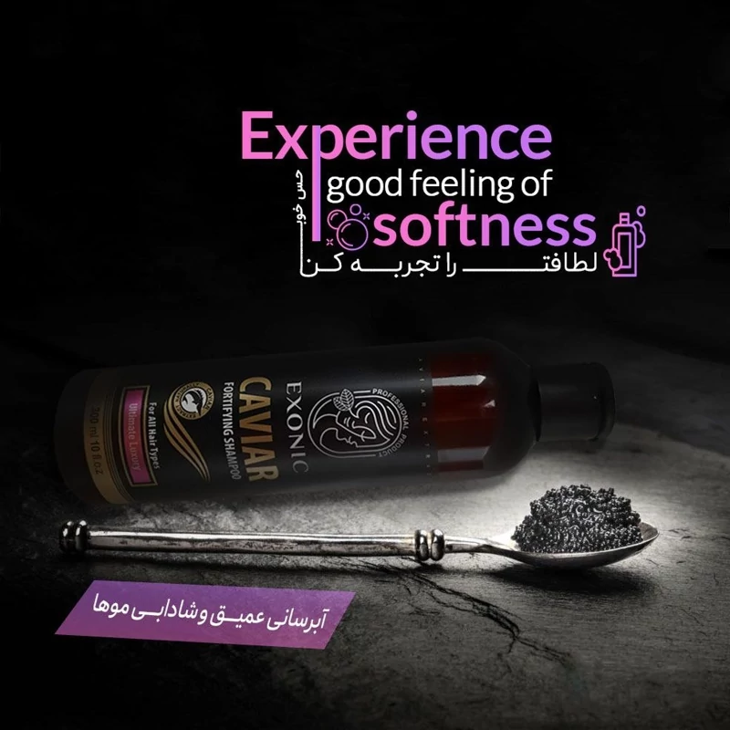 شامپو حاوی عصاره خاویار Exonic حاوی مواد ضدالکتریسیته ساکن بوده و شانه پذیری موها را افزایش داده و به آن ها حالتی ابریشمی می دهد. استفاده از این شامپو باعث ایجاد یک لایه حفاظتی روی موها می شود که آن ها را در مقابل اشعه مخرب UV نیز محافظت نموده و موجب حفظ رنگ طبیعی مو نیز خواهد گردید